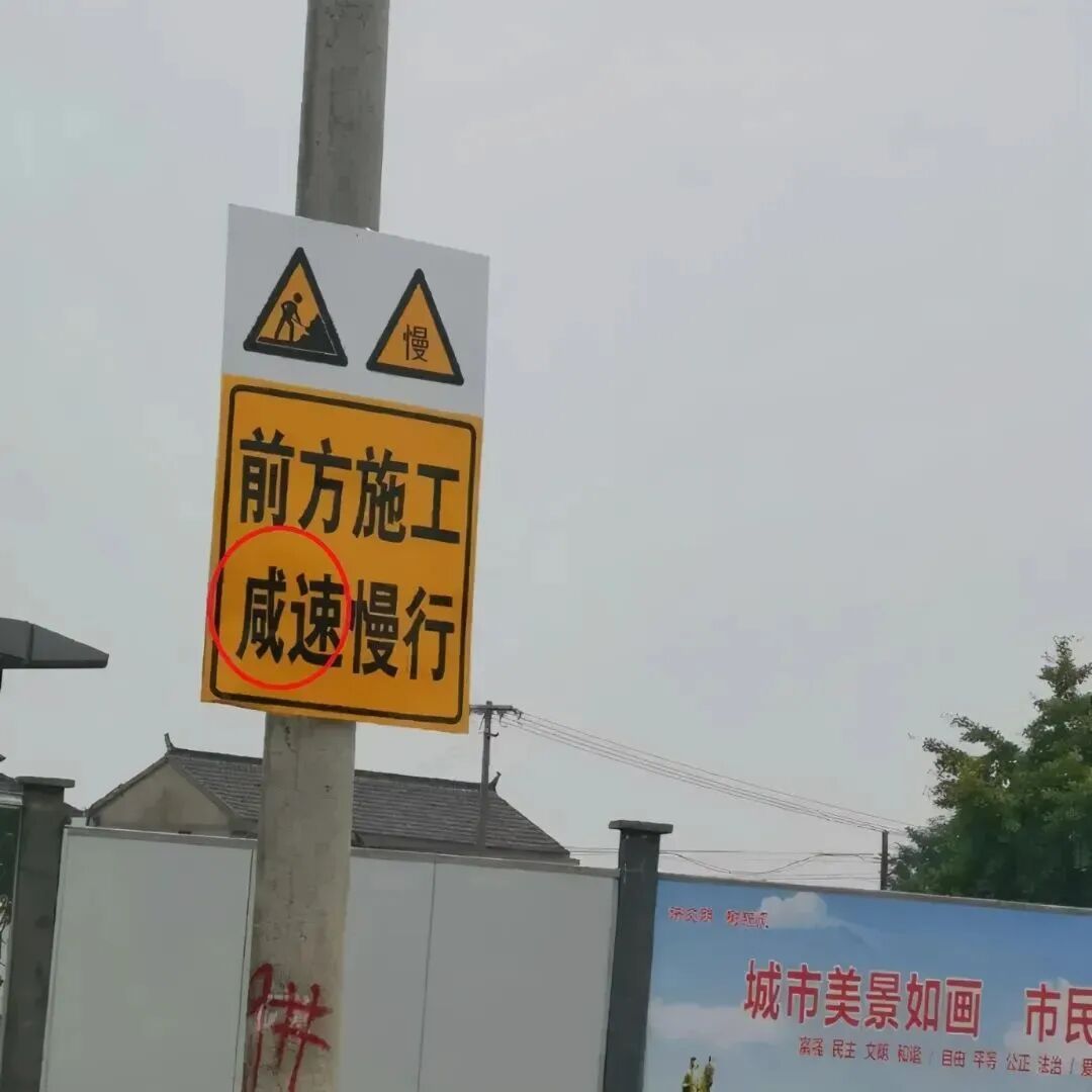 前面这瓶醋还挺“酷”,可这个市政警示牌“一点也酷不起来”。试想一下,如果有车看到警示牌没有“减速慢行”,那将是一件可怕的事。