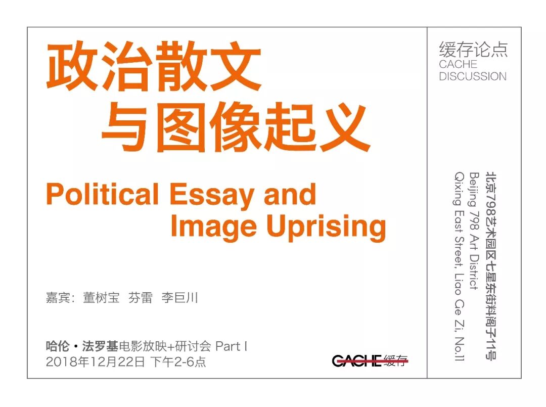 刘伟伟:我对政治和起义比较感兴趣,对于图像和散文,没什么期待。因为我觉得今天正如马永峰所说,我们深陷图像的泥沼当中。今天怎么就出现了这种图像的泥沼,或说我们在其中该怎么进行一种挣扎或起义。我前一段时间写了一个关于国外的法医建筑小组的文章,法医建筑他们制作的录像就是从几千万的影像碎片当中提取出作为证据存在的那些片段,然后重新排列出一种直指事实的东西,他们提供给了我们一个这样处理图像的逻辑过程,比如他们通过导弹的遗留痕迹或是事件发生之后的遗迹,然后从中发现图像,从而判断这些地方曾经发生过的暴力事件或是人权冲突事件。还有,就是今天我们如何有效的利用我们能看到的这些图像去行动。比如北京的艺术家王我,曾经在栗宪庭电影基金会被封的时候,利用现场的一些图像、录像,制作成了一部电影叫《没有电影的电影节》。我觉得他这也是一种方法,他有效地利用了今天图像泛滥里面最重要的一部分,制作成作品去和公众产生一种对话,其中有反思,有批判,属于政治评议电影的范畴。今天最吊诡的事情时,每个人都可以利用图像去表达,也获得了这种权利,就是一种在图像上民主化的解放,但是在中国,马上就会被转化为一种消费主义的东西。我们看到那么多的视频APP上都有大量的人每天在制作、分享着图像或录像,但是它们中却少有能产生反思性的东西,也许是本身的这种审查制度把这部分可能给屏蔽掉了。我就在想怎么能避免这样现象呢?我一个朋友给我一个建议,就是有意识的去购买工人在工作时利用自己手机拍摄的的短视频作为资料,然后制作、利用、传播这些图像,我觉得可能这也是一种方法。我只是谈谈如何从图像的泥沼中挣脱出来的方式。我今天看法罗基的电影,容易给人一种陷入论述的泥沼中的感觉,反而阻碍了我们进入现场的行动。我觉得正如戈达尔所说,我们该如何政治的去处理那些节点,从而激发人们在现实中去行动。我觉得先试试嘛,不用先急着去批判。就是在我们了解了这些制作影像或是影像背后生产的逻辑后,我们如何去处理影像?是不是可以把剪辑的权利给予那些处在问题中心的人共同分享呢?或者是能不能形成一个底层影像的相互联合呢?或者是建立一种东西来翻转对这些影像的使用,形成一种对当今消费图像的起义。但是我觉得它需要一个思辨系统来对众多影像进行一种连接,因为今天人人都有一部手机,人人都是影像的创作者,图像也好,录像也好,已经变得非常普及,非常平庸化了,我们如何从中剥出东西来?