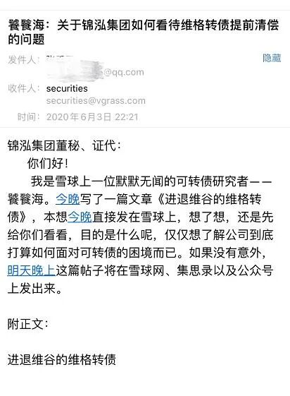但这一次,我关注并和锦泓集团联系沟通,其目的并不是为了从中牟利或者雪上加霜踩公司一脚,而是想通过沟通推动市场对可转债持有人权利的明确和认可,并明确两件事情。一是可转债持有人是否属于公司的债权人,受《公司法》第177条的保护并享有债权人的权利;二是公司能否尝试推动可转债首次突破《募集说明书》关于净资产的限制——先修改《募集说明书》,再破净下修。这两点都是可转债历史上没有触碰过的禁区。可转债在A股出现快30年了,却没有任何一家上市公司认可可转债持有人享有《公司法》第一百七十七条的权利,这也算是黑色幽默了吧。同时上市公司的《募集说明书》明确规定,经债券持有人会议通过可以修改《募集说明书》,可这一条也从未有人触及。历史上总要有人来尝试做一些徒劳无功的事,虽然可能性渺小,难度巨大,劳神费力又不讨好,但我还是愿意做一次唐吉坷德,向风车发动一次冲锋。这个风车并不是锦泓集团,而是所有的已发行和将来可能发行可转债的上市公司。