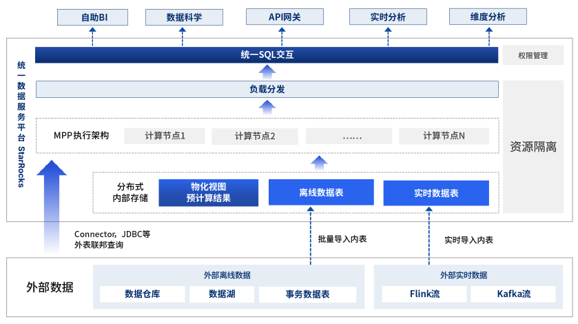 作为一款高性能全场景的分析型数据库,StarRocks 使用 MPP 架构、可实时更新的列式存储引擎等技术实现多维、实时、高并发的数据分析。StarRocks 既支持从各类实时和离线的外部数据源高效导入数据,也支持不做数据转储,便可直接通过外表形式分析查询数据湖的数据,统一的 SQL 交互将数据分析结果或物化视图预计算结果分发到各个数据应用,为中信建投实现了三套系统使用功能的整合以及数据应用流程的简化。