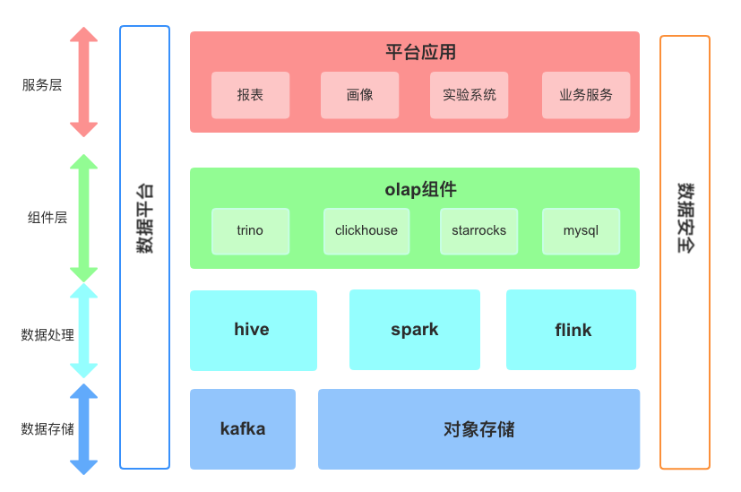 作为公司内部大数据平台部门,主要负责公司海量数据处理、数据质量保证及指标体系维护的工作,服务公司四大业务场景:用户画像、报表、实验系统以及业务服务。公司大数据平台经过上云及几次云平台迁移,当前结合某云 EMR、对象存储建设存算分离的架构,主要架构如下图所示: