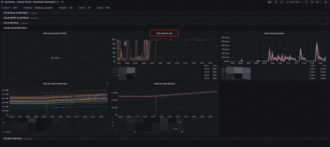 在某些情况下,如我们所经历的,DataCache 时间和用户查询时间的不匹配可能导致频繁的冷数据读取,这不仅增加了对 COS 下行带宽的压力,甚至在极端情况下可能导致整个集群的响应能力下降。为避免这种情况,我们可以通过 StarRocks 提供的监控工具来跟踪缓存命中率。