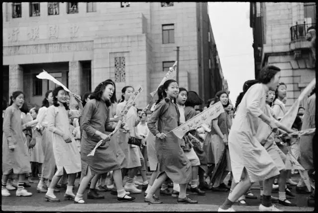 学生举行反黑市的“8.1”胜利大游行,队伍经过外滩,上海,1949年