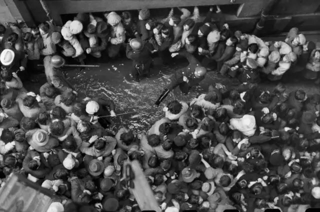 上海抢购黄金风潮,由于纸币贬值,国民党决定每人可以兑换40克黄金, 12月消息传出,数以千计的人们排队等待,有十人拥挤致死。上海,1948年12月—1949年1月