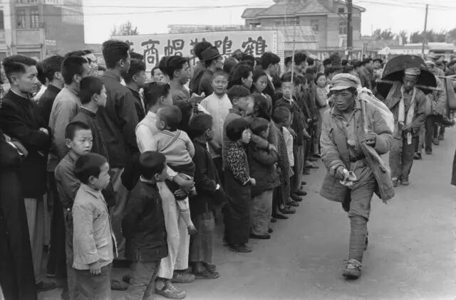 第一批到达的解放军,对面是好奇的人民群众,南京。1949年4月