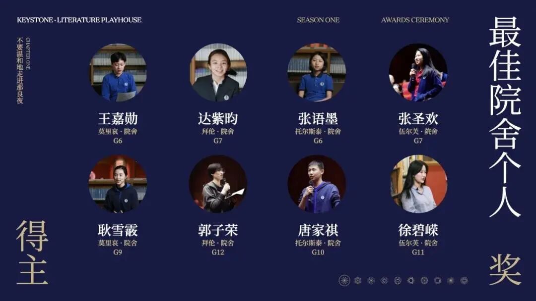 每一个院舍个人构成了一个个院舍集体。在第一季「文学剧场」的四个院舍中,每位院舍成员都在以自己的方式为所在院舍赢得积分和荣誉。在这次庆典颁布的10项奖项中,「最佳院舍」的归属最令同学们期待。