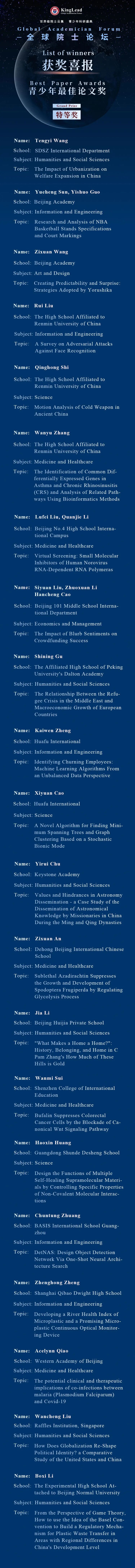 Global Academician Forum and Youth Scientific Research Forum devotes to ignite young people's passion for innovation and scientific research, and cultivate research literacy. The committee solicits scientific-research papers from outstanding teenagers from international schools all over the world based on six disciplines, including Humanities and Social Sciences, Economic Management, Science, Information Engineering, Medicine and Health, Art and Design.
