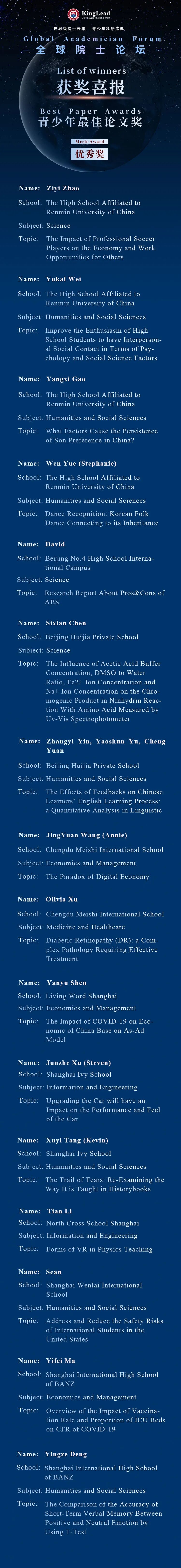 Global Academician Forum was jointly initiated by KingLead and scholars from Harvard University, University of Cambridge, and University of Oxford, etc. Global Academician Forum is committed to improving education on a global scale, holding the mission of cultivating international and innovative talents, and relying on more than 100 full professors from the Ivy League, including Harvard University and top universities such as University of Cambridge and University of Oxford. The forum will build the world leading platform for high school students to do research to ignite young people's passion for innovation and scientific research, and to help more schools to cultivate their students with research literacy. The ultimate goal is to promote our society to emerge more young people with the literacy of international and innovative talents.