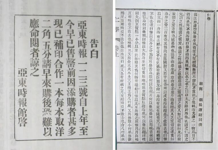 《亚东时报》本虽然首次刊登《仁学》(第5期,1899年1月31日)较《清议报》晚了将近一个月(第2期,1899年1月2日),但却是首次将《仁学》刊登完毕的(第19期,1900年2月28日),比《清议报》(第100期,1901年12月21日)早了一年零十个月。