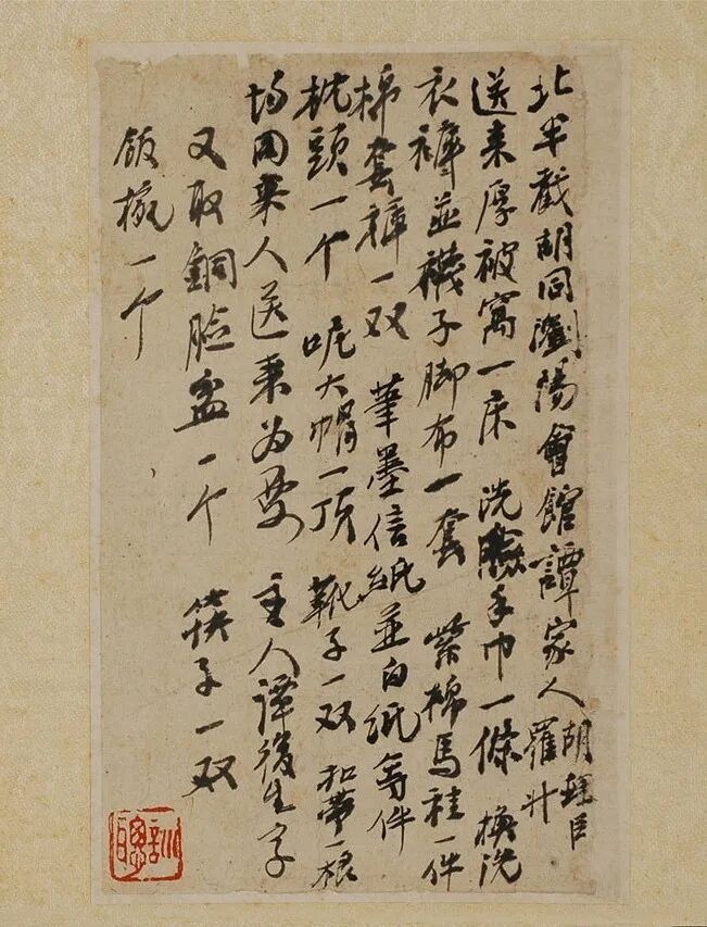 送来厚被窝一床,洗脸手巾一条,换洗衣裤并袜子脚布一套,紫棉马桂一件,棉套裤一双,笔墨信纸并白纸等件,枕头一个,呢大帽一顶,靴子一双,扣带一根,均同来人送来为要。