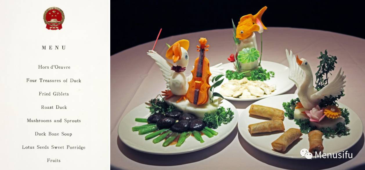 左:宴请尼克松的人民大会堂国宴的菜单。右:纽约的顺利宫餐厅复制了国宴中的三道菜