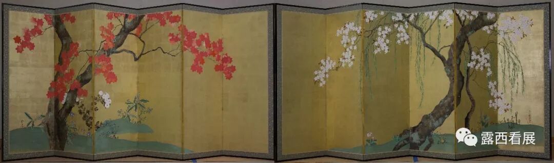 日本馆里正在举办一个小型日本江户时代描绘“自然中的诗意”绘画展,能让大家粗略了解日本的两大绘画派系:所谓“中国派”的黑白山水 VS. “日本派”的艳丽山水,每个派系下面自然分类众多。特展中展现了日本绘画中的春、夏、秋、冬,其中以琳派屏风最为惊艳(展厅225上图:枫树和樱花)。