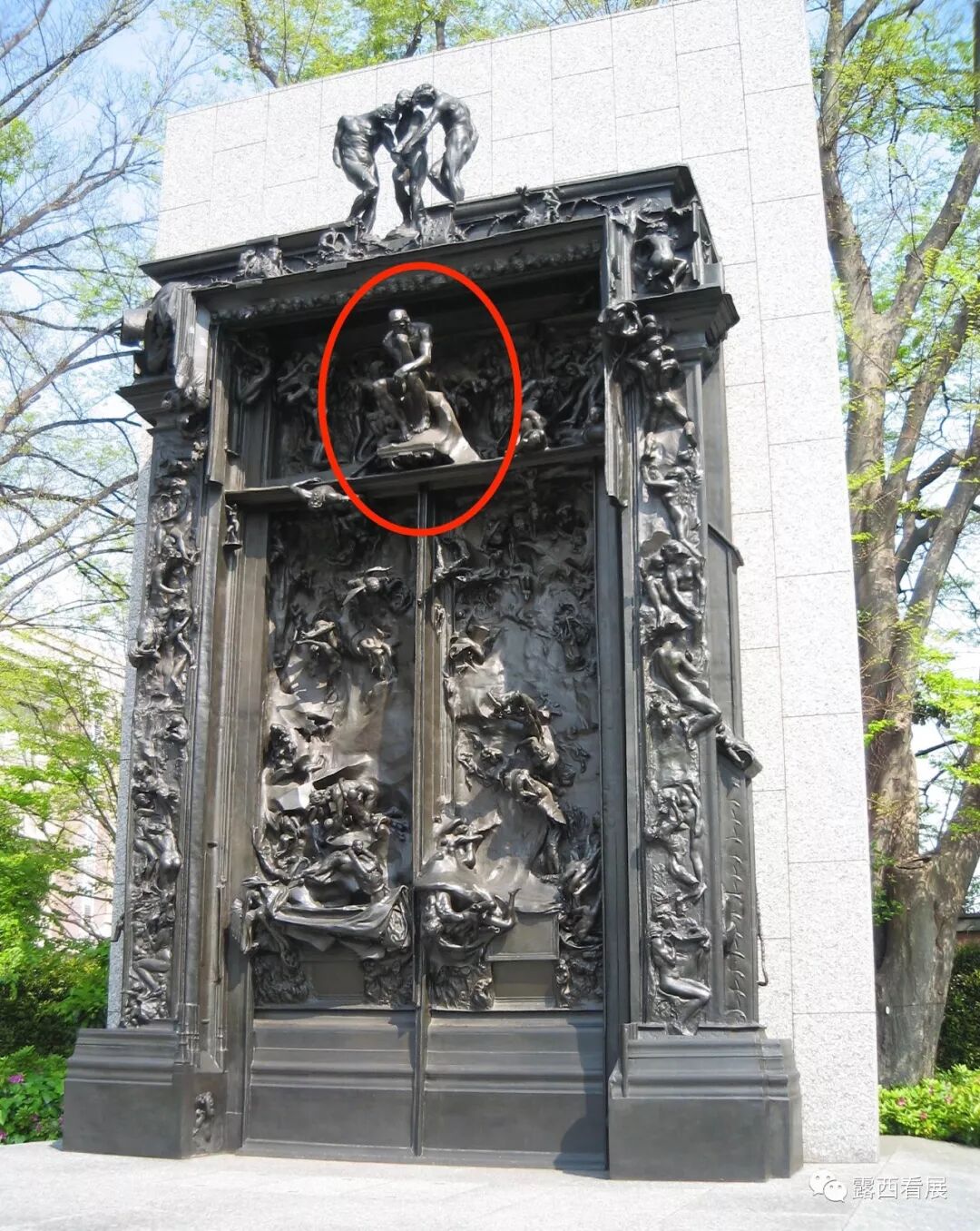 没错,就是“思考者”那个罗丹,小学课本里那个罗丹!在展厅800,我们还可以看见法国雕塑家罗丹最著名的作品“思考者”(上图)。浑身肌肉扎实、一手托腮的“思考者”原先坐落在罗丹另一件大作品“地狱之门”上方(下图),描述但丁“神曲”中的一幕,思考者正在“思索堕落人类的命运”。但罗丹在用陶土捏制“地狱之门”的过程,慢慢地演变成了一个实验室:“地狱之门”中的各种小塑像被罗丹一件一件地拿了出来,放大再创作,这才有了这座独立的“思考者”雕塑。