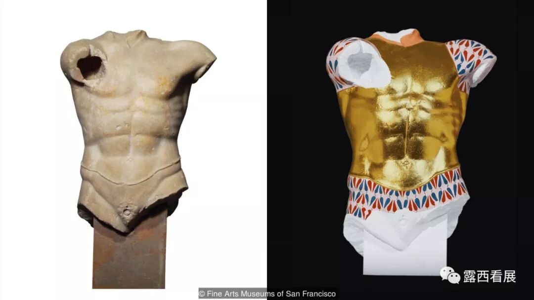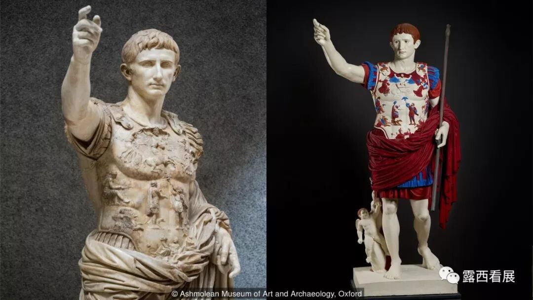 虽然绝大部分古希腊罗马的雕塑都洁白如新、给人以优美端庄的印象,但这些白色雕塑都曾涂有华丽的彩绘,到底是什么具体色调我们无从知晓、但在展厅165的绚丽壁画中可以大致窥得(上图)。学者和修复师们曾复原过一些雕塑、发现这些“纯白庄严”的雕塑们原本是绚烂多彩、甚至还有各种镀金镀银、花式炫富炫权力(下图)。