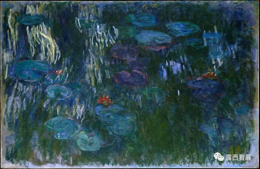 莫奈最有名的“睡莲”系列可以在展厅822找到。此时的莫奈已经在法国北部的吉维尼镇上建了一座巨大的花园,在生命最后几年创作了各种色彩丰富的油画。上图的这幅“睡莲”还算写实,大家还能看出水面、池塘边树的倒影、朵朵莲花、远近大小等等。有些其他的“睡莲”作品慢慢开始展现出“抽象”的意味、慢慢开始“颜色至上”了,如下图(展厅819)