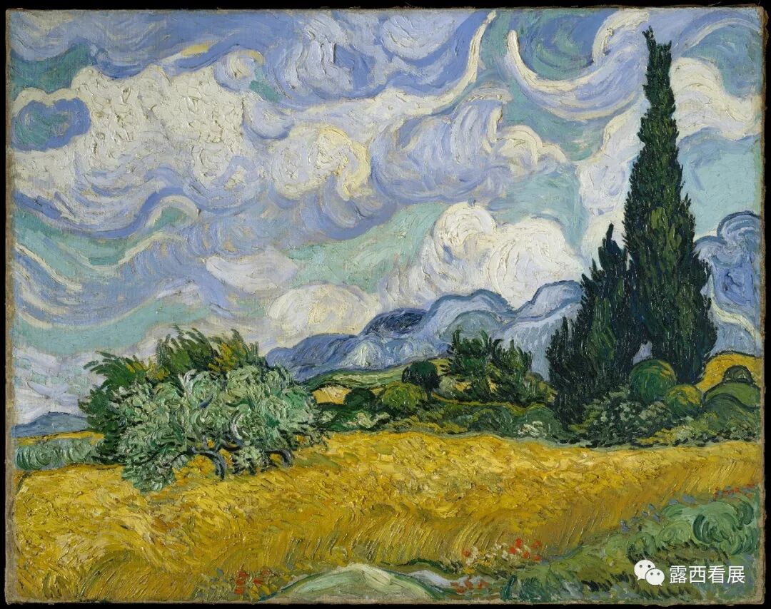 上图这幅“麦田和柏树”在展厅822,是梵高的巅峰之作,完整体现了梵高标志性波浪般激烈的笔触,油画颜料在画布上堆积起来,把天空中的云卷云舒、风吹麦浪的动感体现得淋漓尽致。