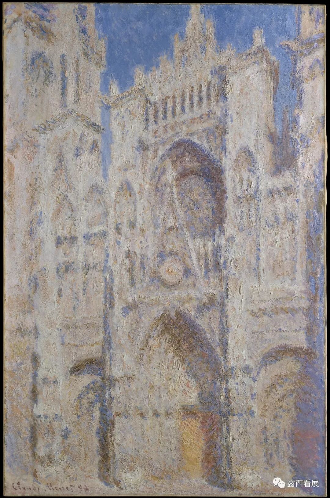 展厅819展出的几件作品则展现了莫奈最为人所知的创作过程:他常常就同一主题对象不断绘制相同角度的油画,但又通过天气情况和绘画时间的不同、努力去捕捉细微的光影差别。印象派的精髓就在于这种对户外光影效果孜孜不倦的极致追求。展厅819的“鲁昂大教堂”(上图)和“稻草堆”就是莫奈最出名的系列作品:鲁昂教堂的正门布满浮雕和各式建筑元素,凹凸不平的表面能产生多变的光影效果,简直是完美的印象派绘画主题。