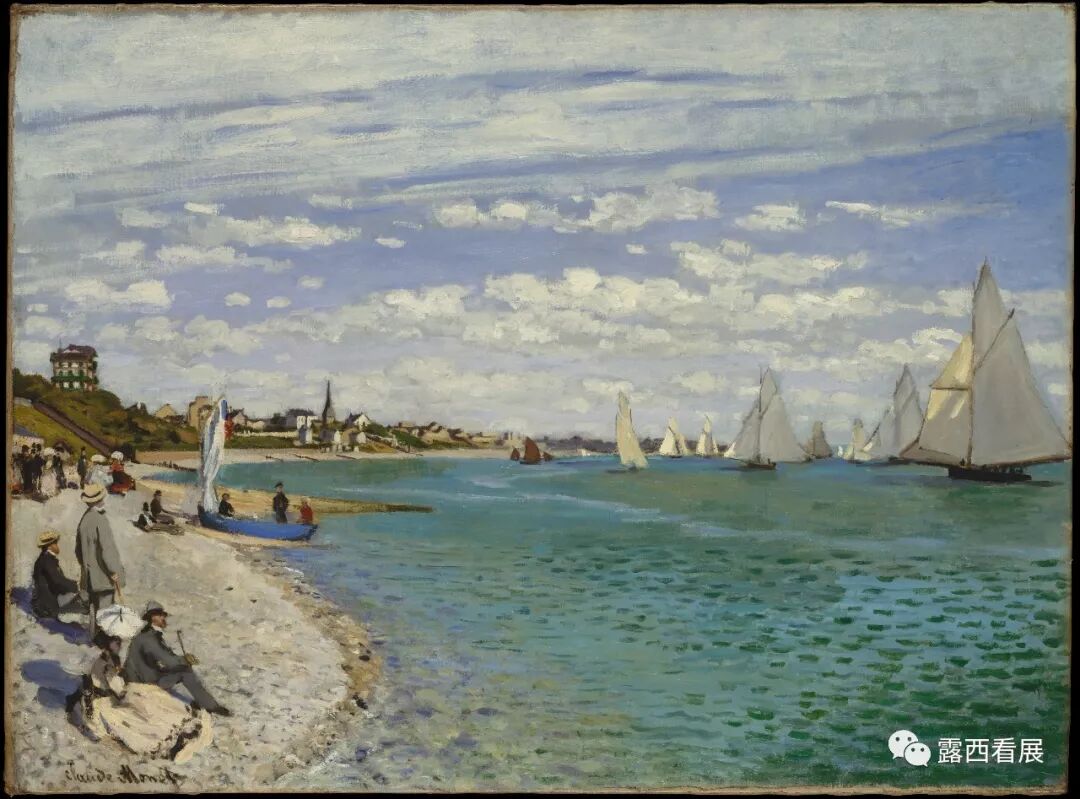莫奈是当之无愧的印象派鼻祖和巅峰人物,他不仅高产、而且创作生涯长达66年之久(他本人也是86岁长寿)。展厅818展出的这幅“圣阿德雷斯的帆船比赛”(上图)属于莫奈早期1867年的画作,当时的笔触还非常细腻、会把人物和建筑的细节描摹出来,色调也相对平和明朗,所谓“鼻子是鼻子、眼睛是眼睛”。