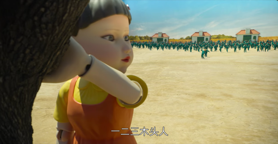 第一关是一二三木头人。这关隐喻韩国教育内卷和扭曲。站上起跑线,人人皆平等。然而,每一步都要经受教育体制的审视,不合格的就被淘汰。