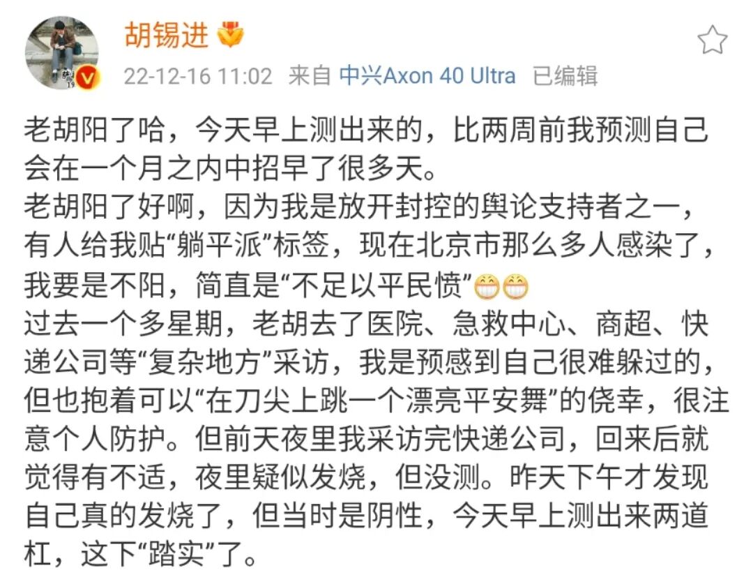 胡锡进一直是封控派,但是在自己阳了的第一天,他立即喜滋滋地跳出来分享自己的经历,搞得好像他早就知道奥密克戎并不是什么惊天动地的大灾祸,亦步亦趋到如此地步,精神分裂到如此地步,也的确属于珍稀动物了。