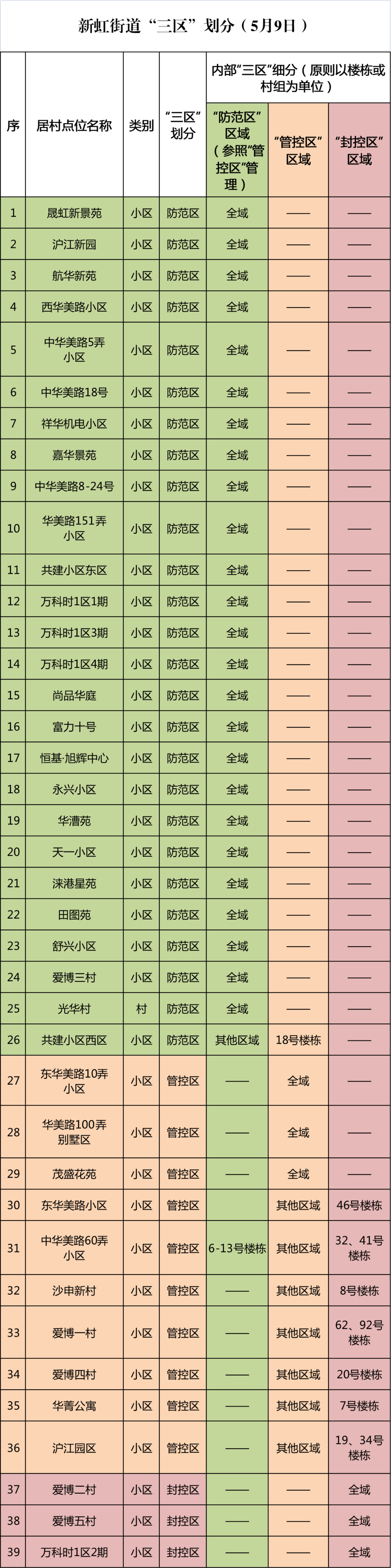 现发布闵行区最新一轮居民小区、自然村“三区”划分情况(信息数据截止时间为5月9日)。