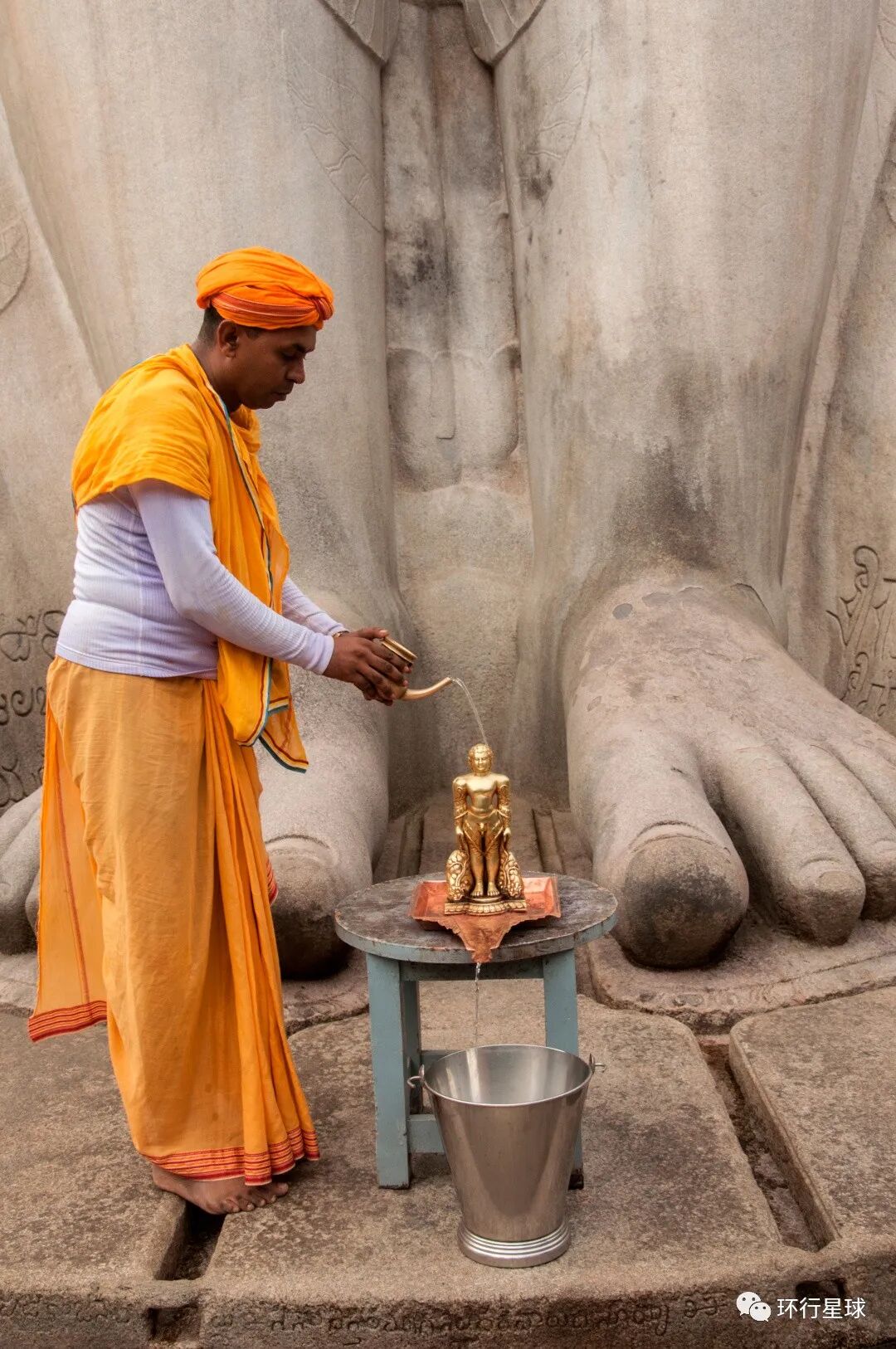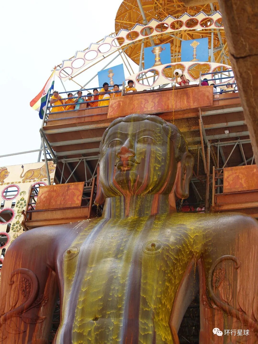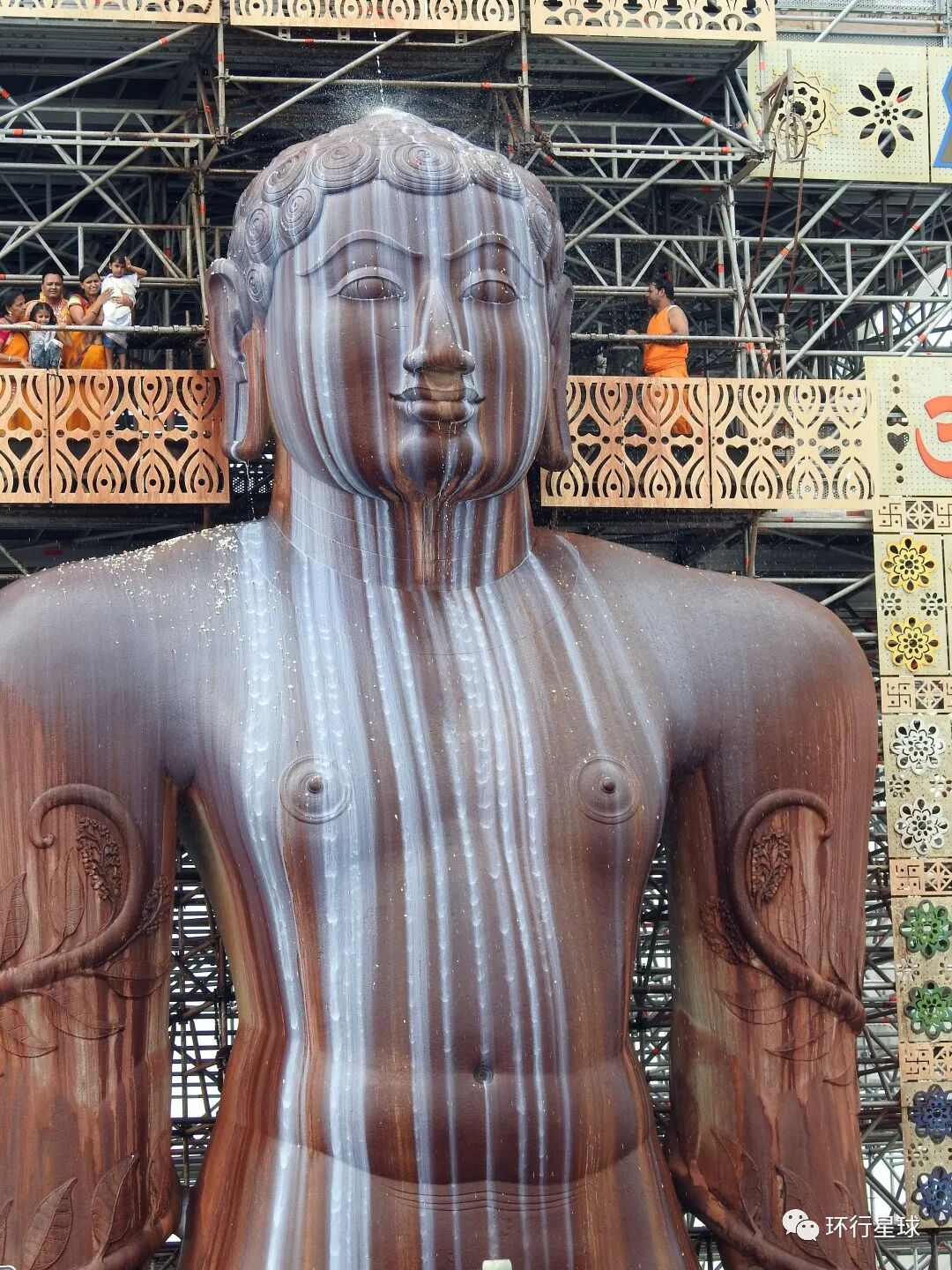 被称为印度七大奇迹之一的南印度耆那教裸体大佛巴霍巴利雕像,每隔12年,耆那信徒会从17米高的神像头上浇下牛奶与香料用以参拜。