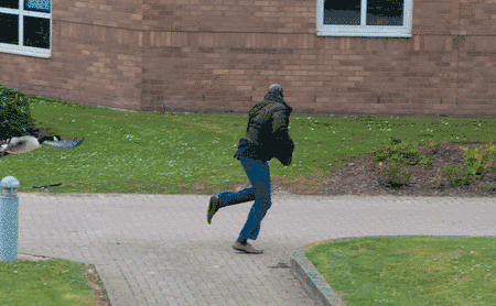 在队友的观看下遭受了大雁袭击的场景
