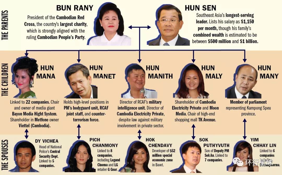 柬埔寨的权力和资源集中掌握在“掠夺型”政治家手中,首相洪森家族被称为柬埔寨首富,家族控股公司就有114家,市值2亿美元,这只是财富的冰山一角。在严重依赖外国投资的柬埔寨,最赚钱的行业是外国公司涉猎的领域,洪森家族的公司与外国公司关系密切。
