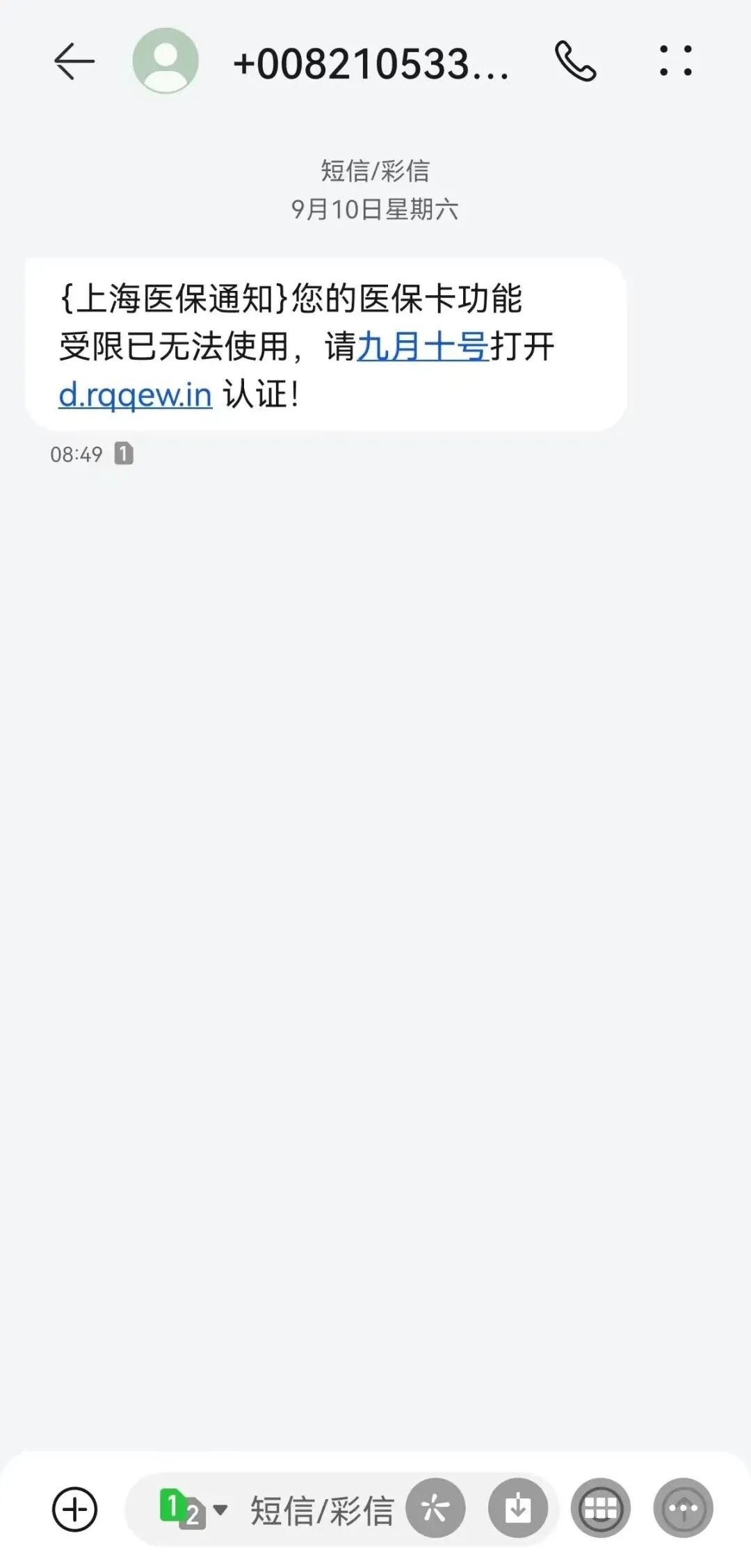 近日有市民向医保部门反映,收到一条“〔上海医保通知〕医保卡功能受限已无法使用”的短信,并要求打开一个网站更新医保信息并恢复使用(如下图)。