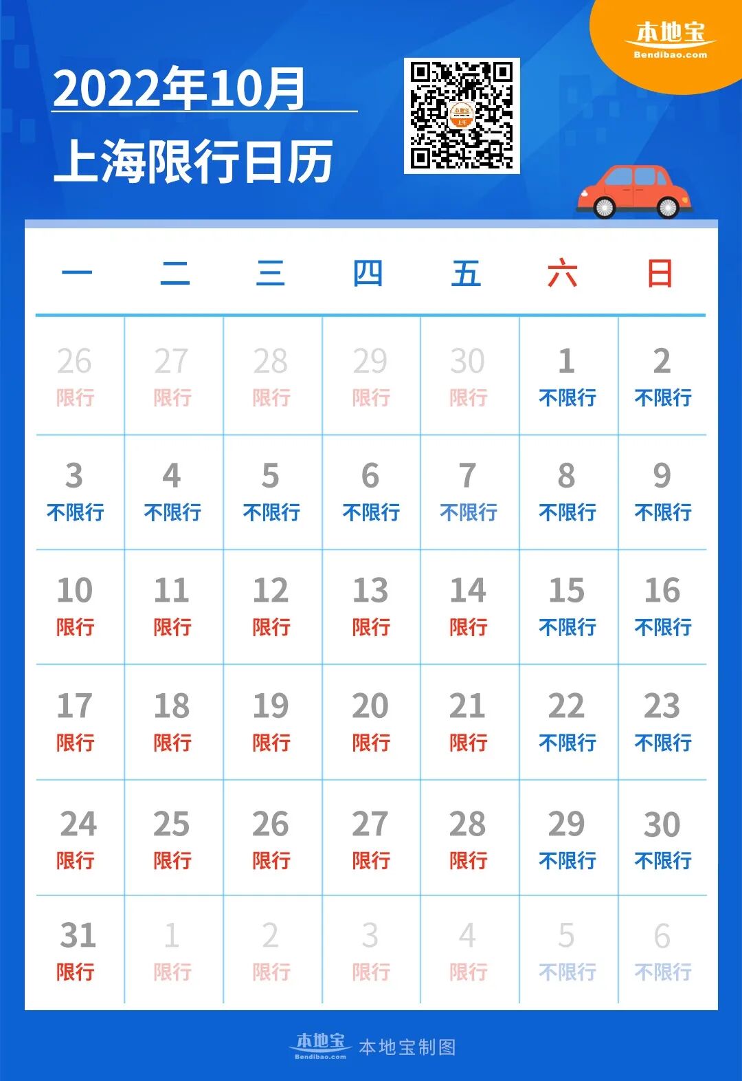 上海10月份的最新限行日历