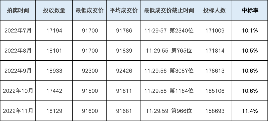 2022下半年来,中标率一直稳中有升,随着沪牌投放额度增加、参拍人数减少,7-11月的中标率更是连续5次破10%,所以想要拿下沪大牌的朋友,一定要抓住2022最后的1次机会哦。