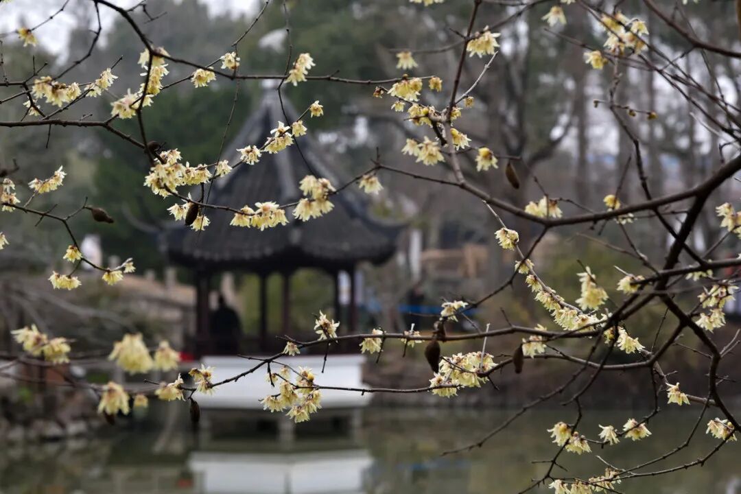 蜡梅与园林中的建筑、小品、山石结合形成不同的古典园林画卷,别有韵味,最佳观赏期可以持续至1月下旬。