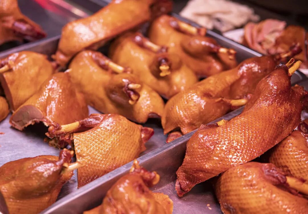 熟食门市画风诱人,鸡鸭鹅牛肉应有尽有,做法多是浓油赤酱的上海本帮风格。南风肉、腊鸡、腊鸭已经切好分好,可以直接整块带走。