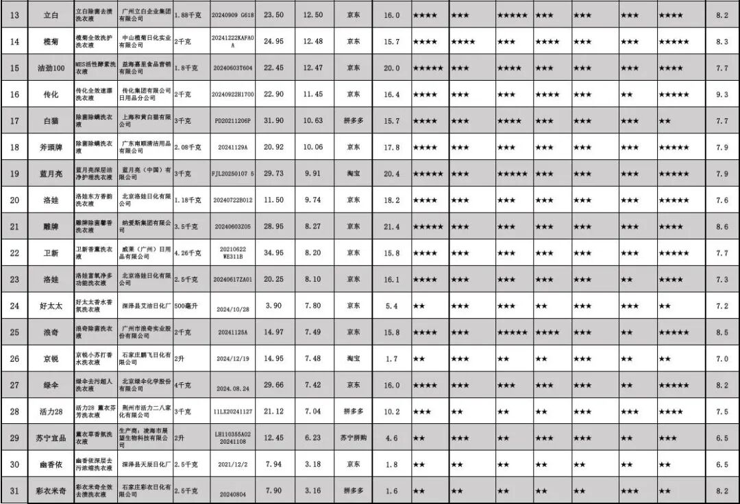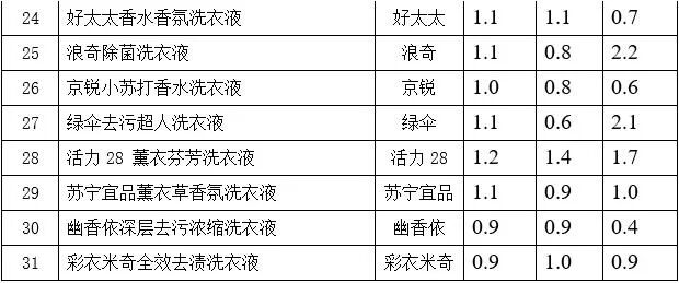 附件:《31款洗衣液比较试验样品基本情况及比较结果一览表》