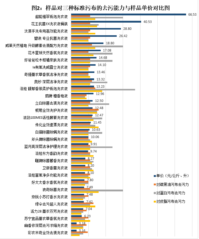 其中标称“洛娃馥郁香氛柔护低泡洗衣液”、“超能植翠低泡洗衣液”、“浪奇除菌洗衣液”、“威莱天然植皂升级酵素去渍配方洗衣液”、“好爸爸松木柑橘亲肤洗衣液”、“蓝月亮深层洁净护理洗衣液”、“花木星球天然香氛洗衣液”、“立白除菌去渍洗衣液”、“奥妙深层洁净洗衣液”等9款样品去污效果更为出色,尤其对蛋白污渍的去污能力表现突出。