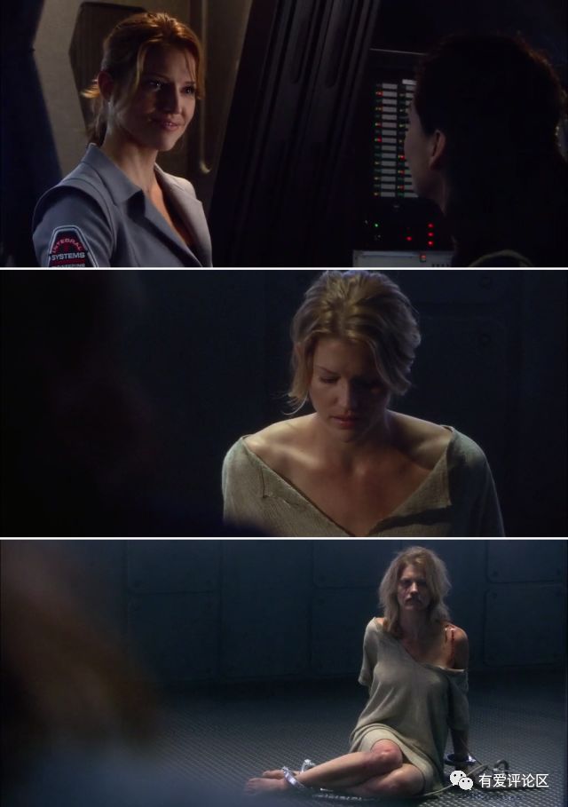 在《太空堡垒卡拉狄加》中,这些心态有了更多更直观的描绘,像是中后期出现的“利刃”号执行的就是标准的军人政治,他们对于人形赛昂人的处置态度,就令卡拉狄加号船员难以接受,也引发了更多矛盾。