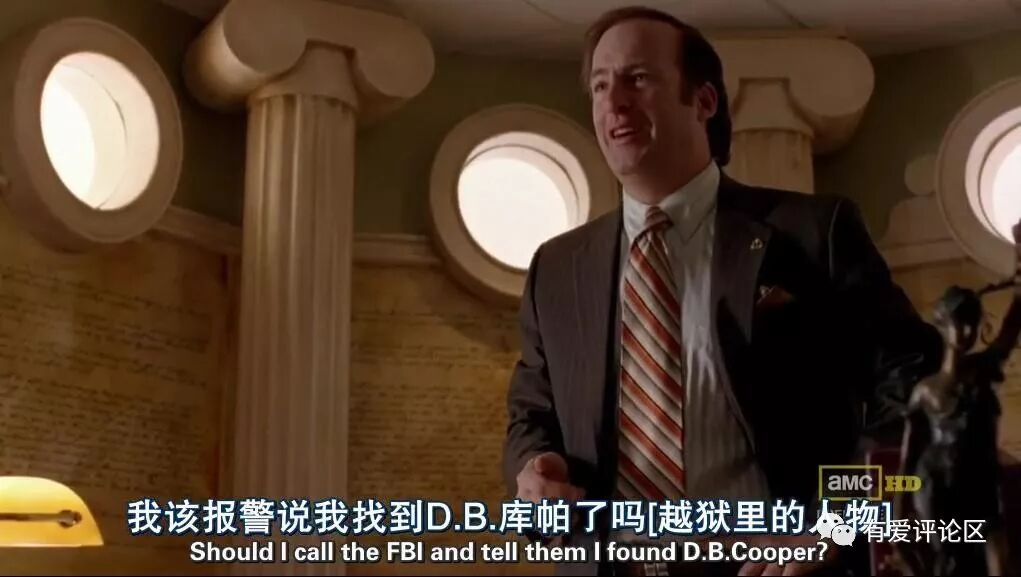 这是索尔与老白第一次见面时的对话。当然D.B.Cooper在历史上也确有其人,不过考虑到毒师的时间线,这里多半是指越狱里的撸猫老头。