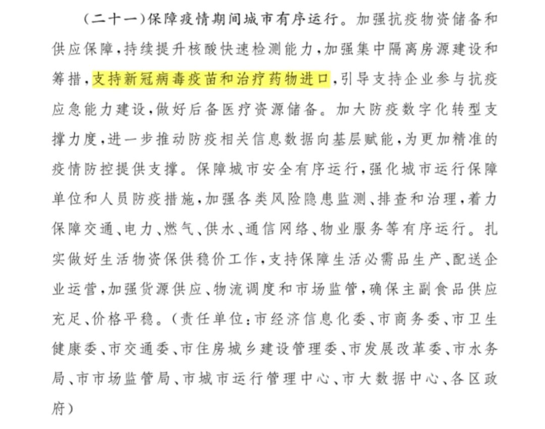 2022年3月29号,上海发布《上海市全力抗疫情助企业促发展的若干政策措施》,"支持新冠病毒疫苗和治疗药物进口。"