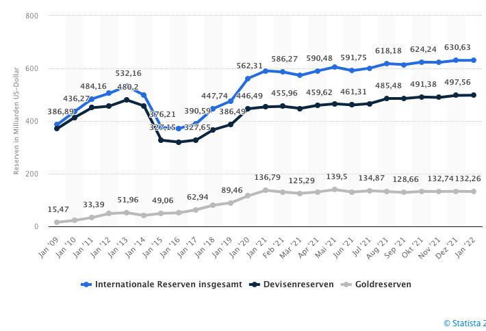 2009年1月至2022年1月俄罗斯中央银行的黄金储备和外汇储备