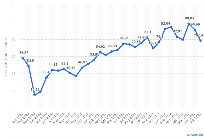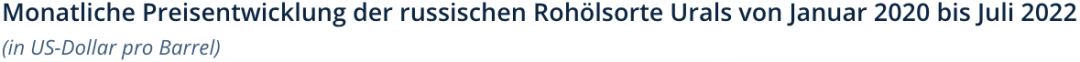 2020年1月至2022年7月俄罗斯乌拉尔原油的月度价格发展情况(每桶油以美金计算)