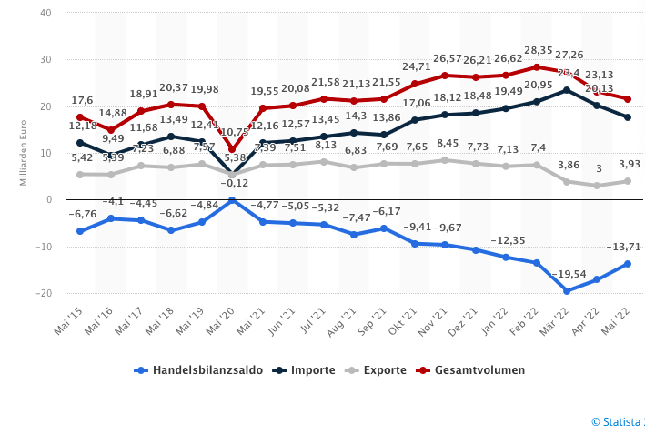 欧盟: 2015年5月至2022年5月与俄罗斯货物贸易的贸易总额和贸易平衡(进口和出口)