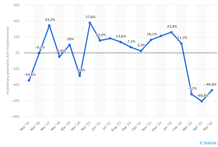 欧盟 2015年5月至2022年5月对俄罗斯货物出口量的相对变化(对比上个月)