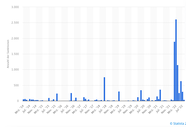 2014年3月至2022年8月,每月对俄罗斯实施制裁的数量