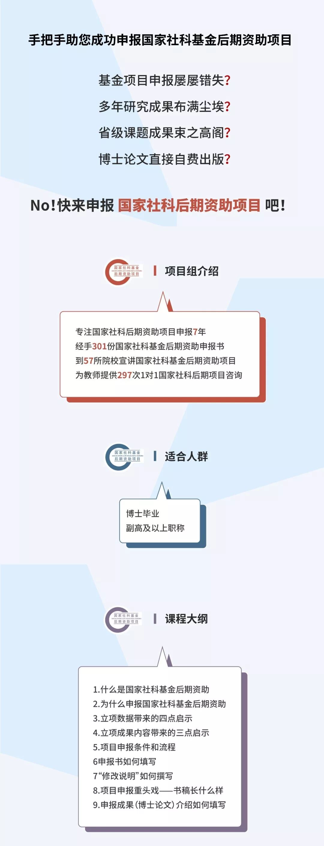 鉴于此,专注国家社科后期资助项目申报7年,经手301份国家社科基金后期资助申报书的项目申报办公室联合科学出版社打造了“手把手助您成功申报国家社科基金后期资助项目”线上课程,九大专题全方位解读后期资助项目申报,还有非注水版礼包——“修改说明”范本+论文报告修改范本,赠送。