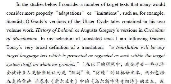 十年前,有一篇文章在“Tymoczko的翻译观”这个小标题下如是说:“Tymoczko认为给翻译下一个严格的定义是不可能的,但是如果勉强给翻译一个定义的话,她认为以色列学者Gideon Toury给出的翻译定义最为可取,因为该翻译概念比较宽泛。Toury认为‘翻译是在译语系统中,不论由于何种原因,作为或者是被人视为是翻译的所有译语文本。’”同年另一篇题为《翻译研究:从规范走向描写》的文章也介绍说:“相对于规范性的翻译理论,描写性翻译理论的一个最大的特点是它的宽容。正如描写学派代表人物图里(Gideon Toury)指出的:什么是翻译?‘翻译就是在目的系统当中,表现为翻译或者被认为是翻译的任何一段目的语文本,不管所根据的理由是什么。’”这两篇文章在其所认为的“翻译定义”后所附的英文原文都是A translation will be any target language text which is presented or regarded as such within the target system itself, on whatever grounds。沙特尔沃斯和考伊编著的那本Dictionary of Translation Studies在Translation这个词条中,也在卡特福德、雅各布森和奈达等人为“translation”下的定义之后列出了图里为“a translation”下的定义,其措辞与上述二文所附英文原文稍有不同,为“a translation is ‘taken to be any target-language utterance which is presented or regarded as such within the target culture, on whatever grounds’”。中文译本《翻译研究辞典》将其翻译成了“翻译是指‘在目标语文化中被视为翻译的任何一种目标话语,不论其理由如何’”。
