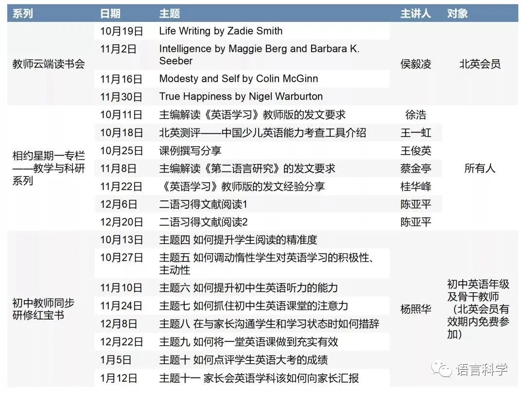 儿研中心将从10月起承办多场“北外英语讲堂”系列活动,覆盖英语学习、英语教学、英语课题研究。