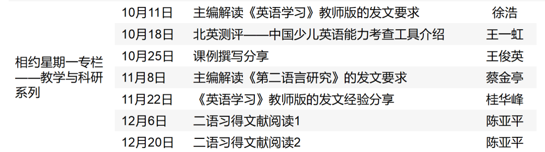 时隔2个月,相约星期一带着7场教学与科研系列活动重磅回归。主讲专家们将围绕英语课题研究与大家分享文献阅读、英语能力考查工具、科研论文发稿要求、课例撰写经验、发稿经验等等。干货满满,只等你来!