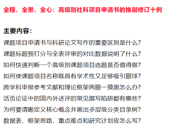 会议主题:全程、全景、全心:高级别社科项目申请书的推敲修订十例