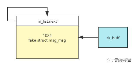 首先利用已经泄露的堆地址将fake struct msg_msg的mlist成员指向自己,这样就可以利用消息队列来释放fake struct msg_msg,之后sk_buff对象会保留一份fake struct msg_msg堆块的引用。