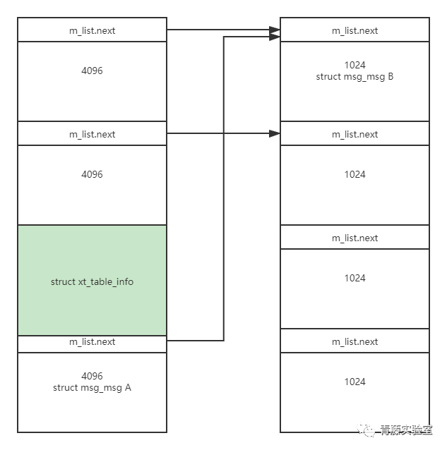 理想情况是我们用xt_alloc_table_info申请回来的4096堆块下方有一块没有被释放的struct msg_msg结构体 A ,这样就可以利用越界写漏洞将struct msg_msg A指向下一个结构体成员m_list.next最后几个字节覆盖为0